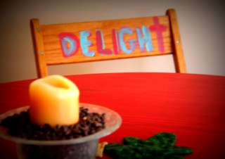 Then this morning, I noticed the two chairs I recently placed around the table, painted with the words: Wonder and Delight.