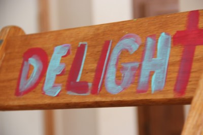 I chose delight last summer, so I decided to paint another word on the second folding chair. I thought to myself, what word goes with delight? Moments later, wonder popped into my mind. I was delighted.