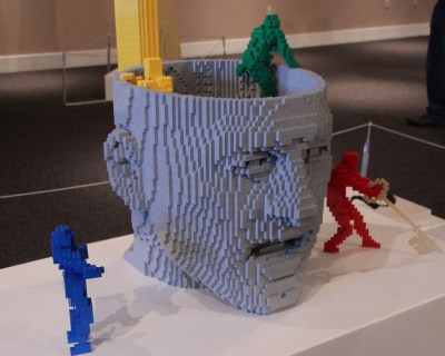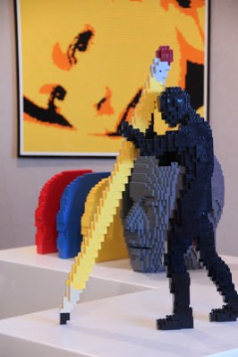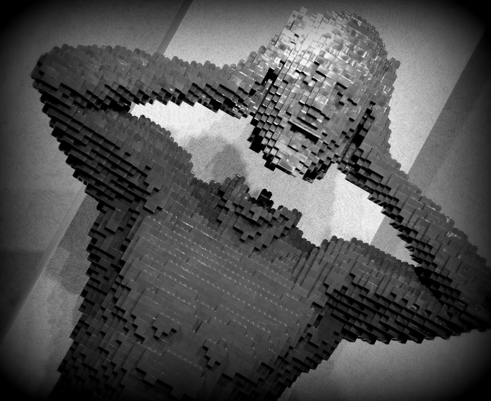 I was captured by the ingenuity and creative expressiveness the artist renders in these Lego creations. I surprised myself with the third photo. I am not certain, but most likely the curator placed these three sculptures in such a way that if you stood in the right spot, you’d be able get this perspective. A scribe overshadowing a brain with ideas generating an image on the back wall. To me it spoke to the process of transforming one’s mind through the creative process.
