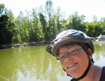 With all this good eating and traveling, we made a commitment to be active this trip. We have our bikes along, so asked Les if I could ride my bike to the next stop while he drove the boat. The canal has a speed limit of 10mph, and most times you have to go slower because of the no wake zones. At that pace, we could see each other as I pedaled on the canal trail and he cruised the canal.