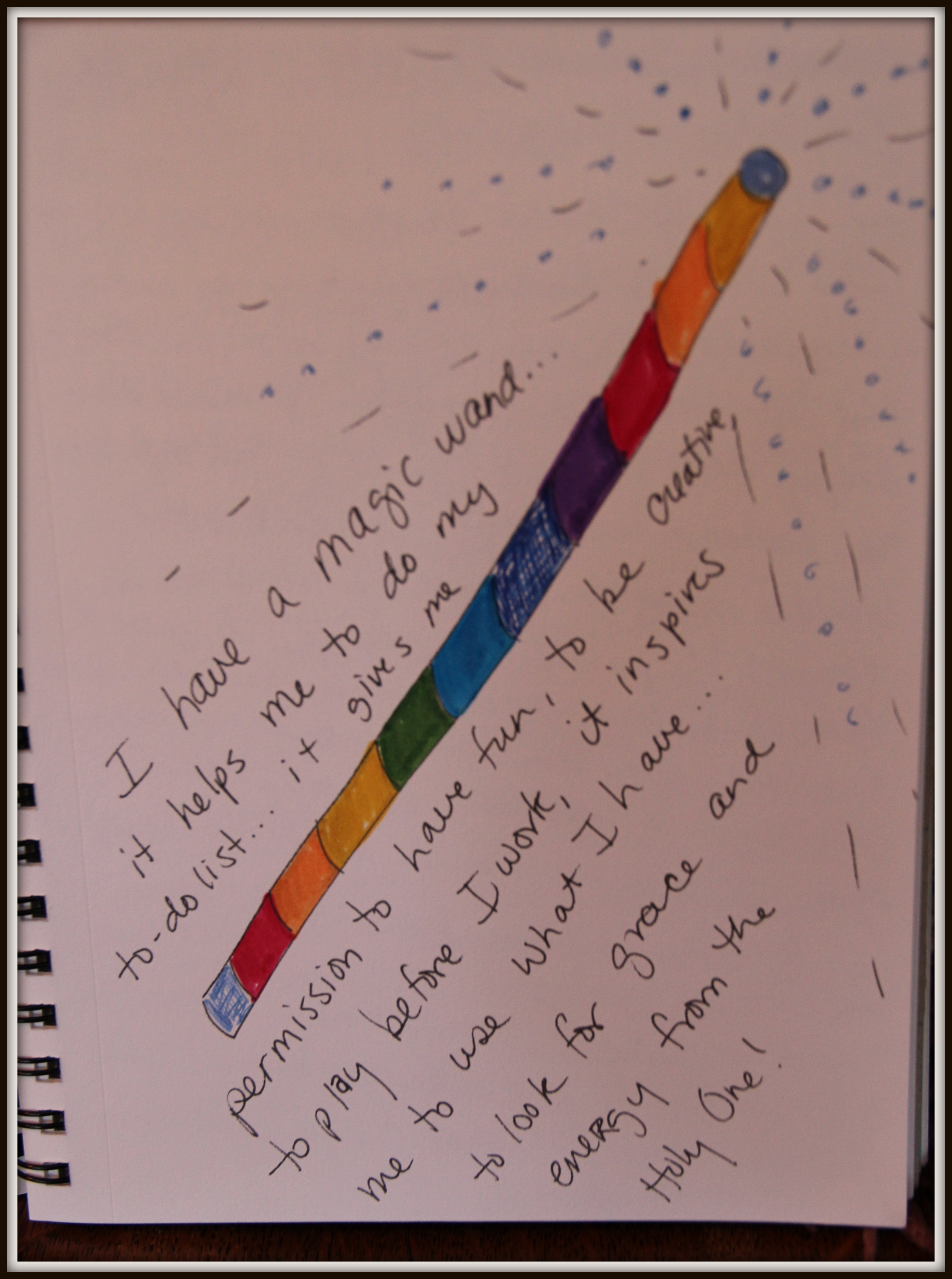 I have a magic wand…it helps me to do my to-do list…it gives me permission to have fun, to be creative, to play before I work; it inspires me to use what I have…to look for grace and energy from the Holy One!