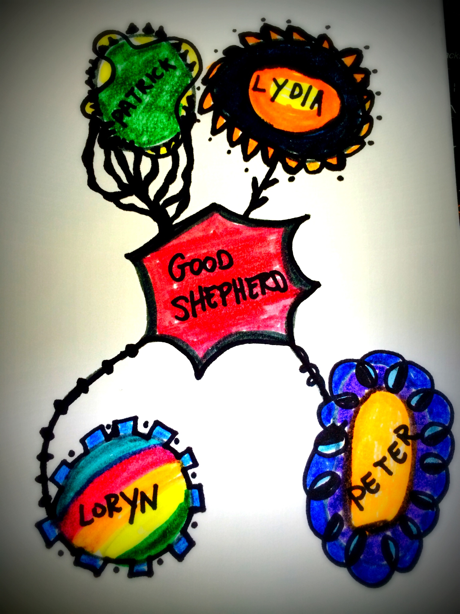 In the center shape, I encouraged them to write a characteristic or action of God and then add names of people in their life that they wanted to experience God. Below is my colorful prayer for each child to experience God as the Good Shepherd.