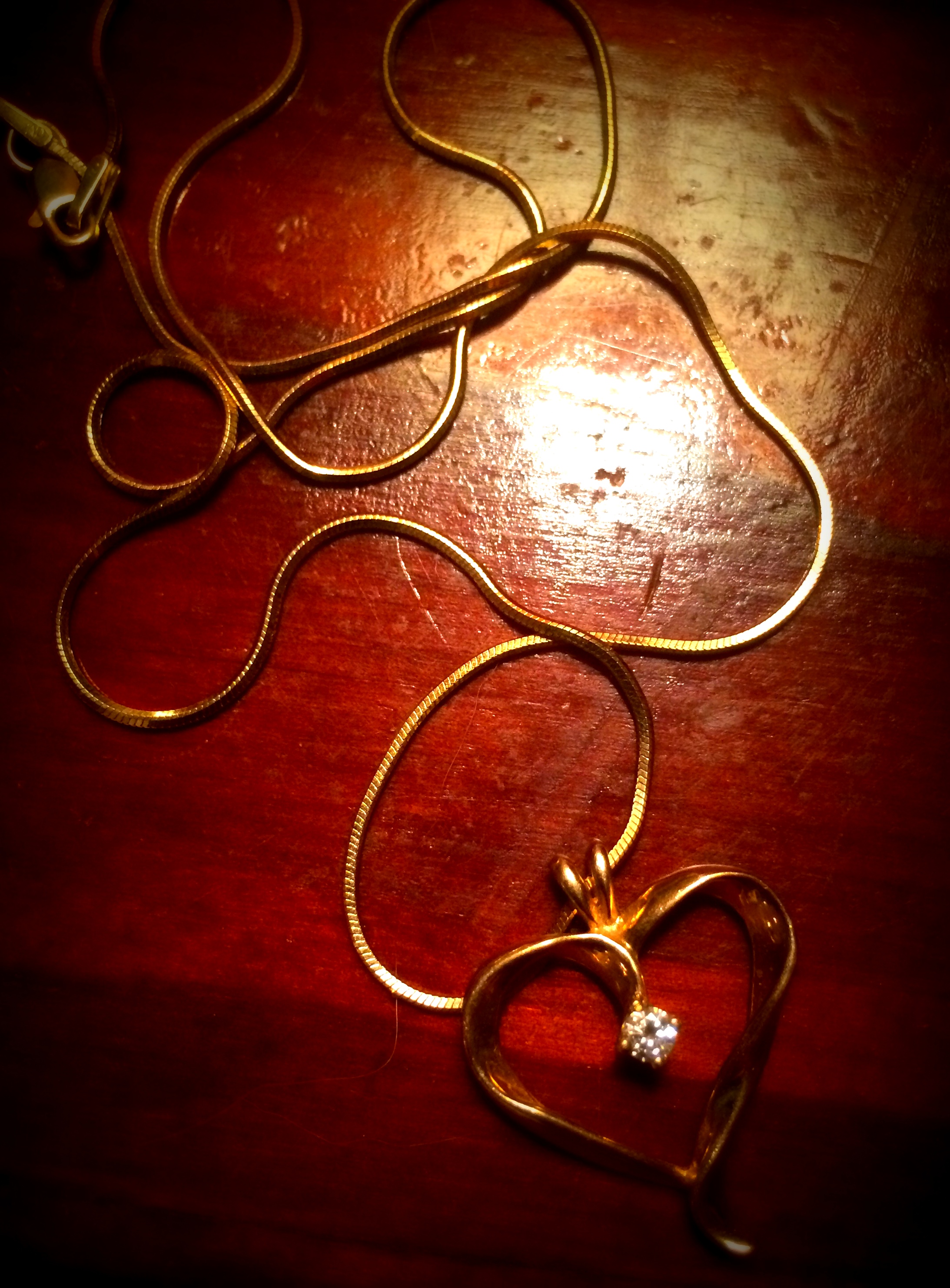 The necklace that God inspired my husband to buy and my son to hide and give to me on that Valentine’s day so many years ago, and the necklace that I thought was lost, but was tucked deep in the pocket of a suitcase, which by the way, the same son was rumaging through and found the necklace, and placed it on my dresser.