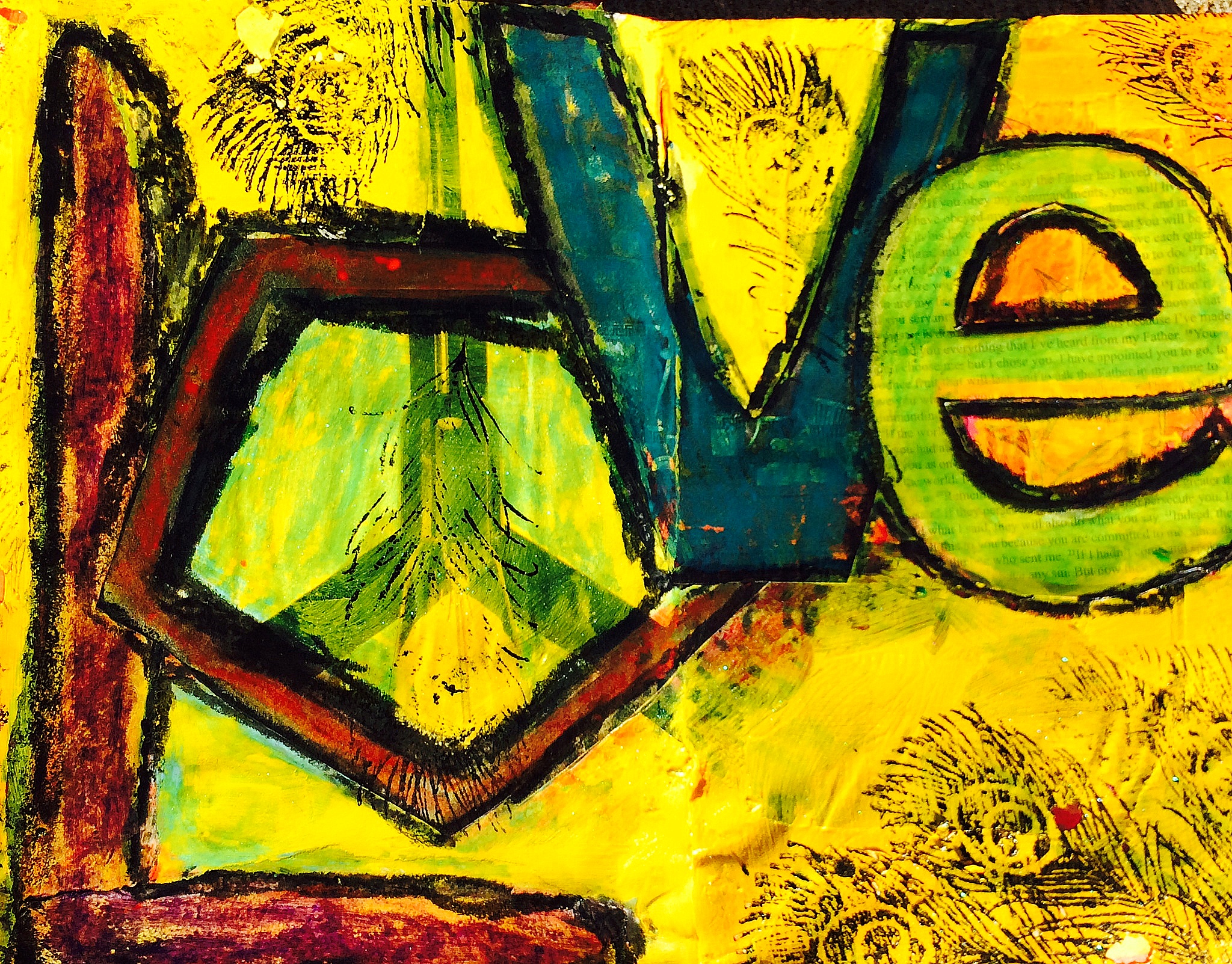 I started out this morning with a clear vision. I had two images of baguettes that became the letter “L”, a light fixture that looked like an “O”, and colorful backdrop that I could cut into a “V”, and some Scriptures from John 15, which I fashioned into an “E”.