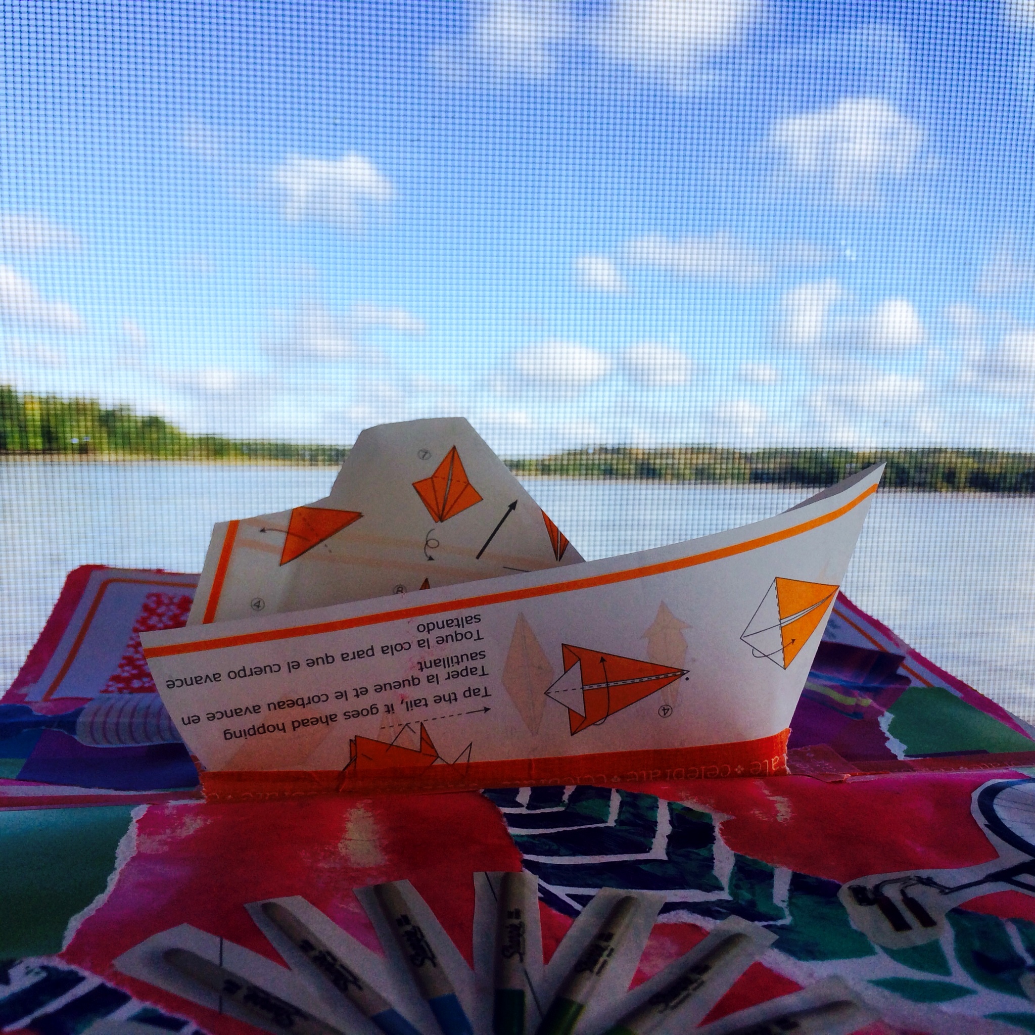 The stash included some origami instructions. I noticed a simple boat; I used a square from the instructions to make the boat.