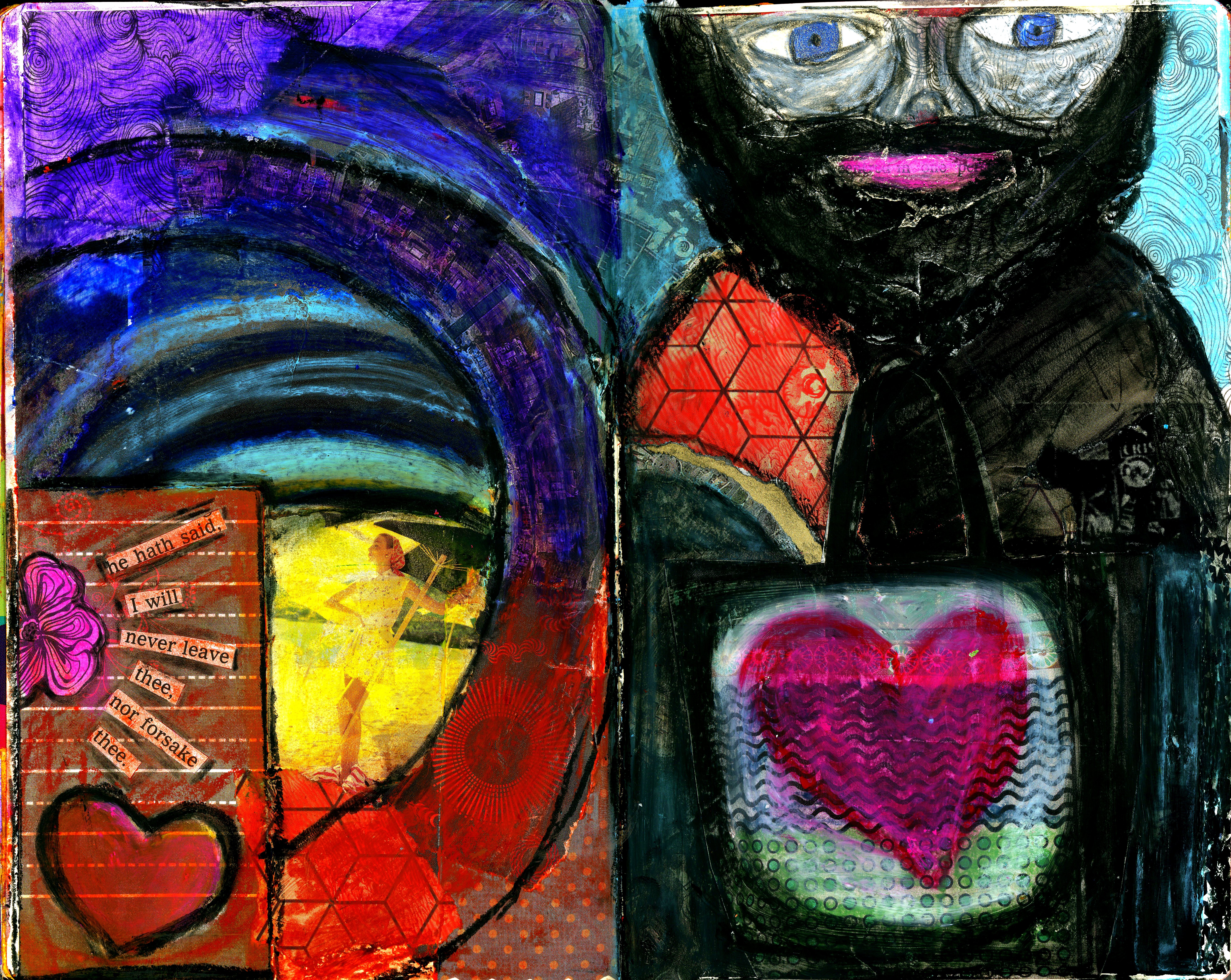 As I glued scraps of paper down to cover some text, a shadow of a face emerged. That the face had a beard and mustache moved me towards sketching the face of Jesus, as it is often pictured in children’s books. I used the other images to create His tunic. On the opposite page, I surrounded the girl with blue toned rings. Then I added the Scripture from Hebrews 13:5.
