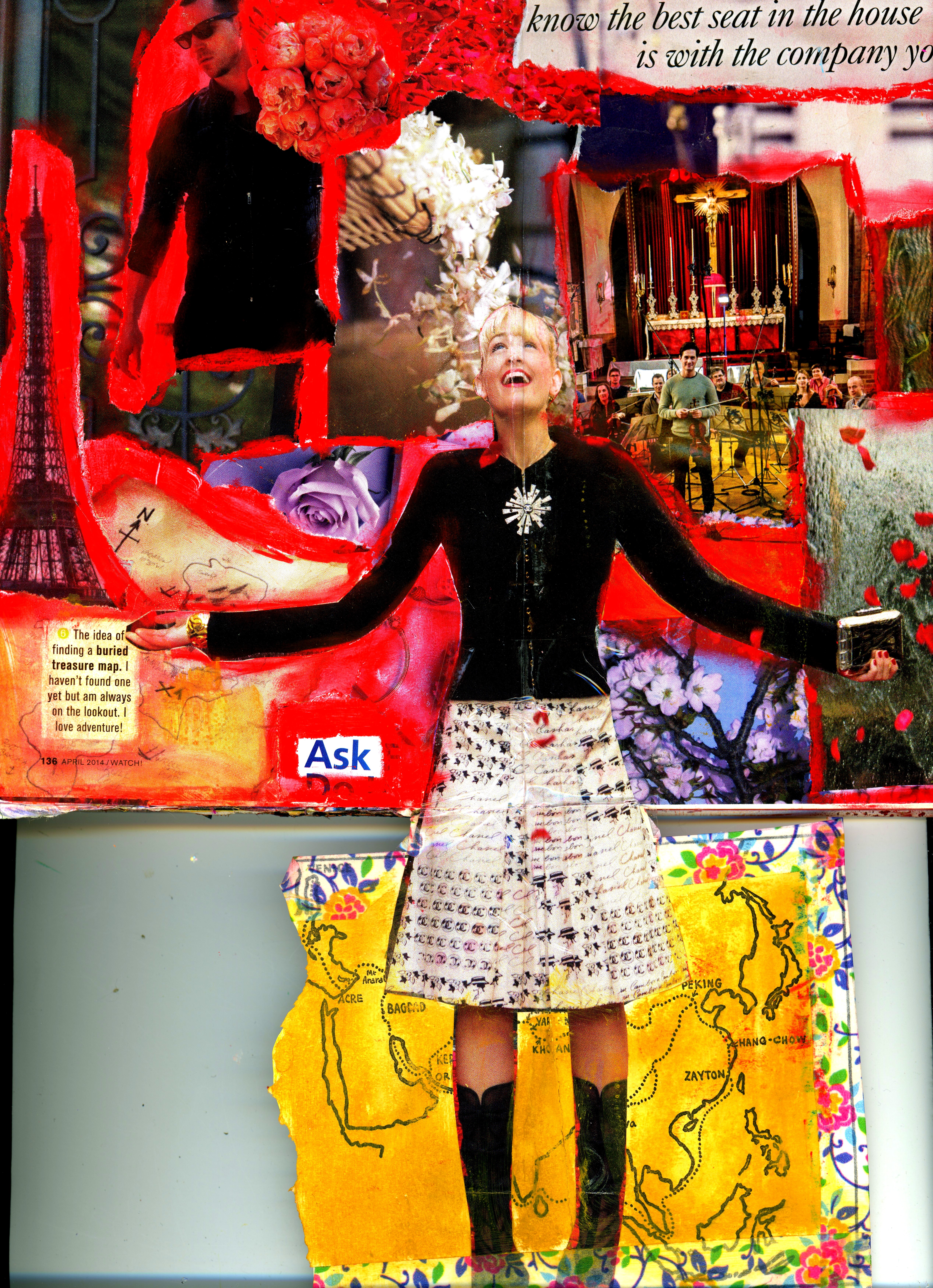 As I was working on my collage for today, I found an image of a woman with arms raised embracing the moment. She was a little too tall for my page. Lynn and Kelly suggested that I let her hang off the page.
