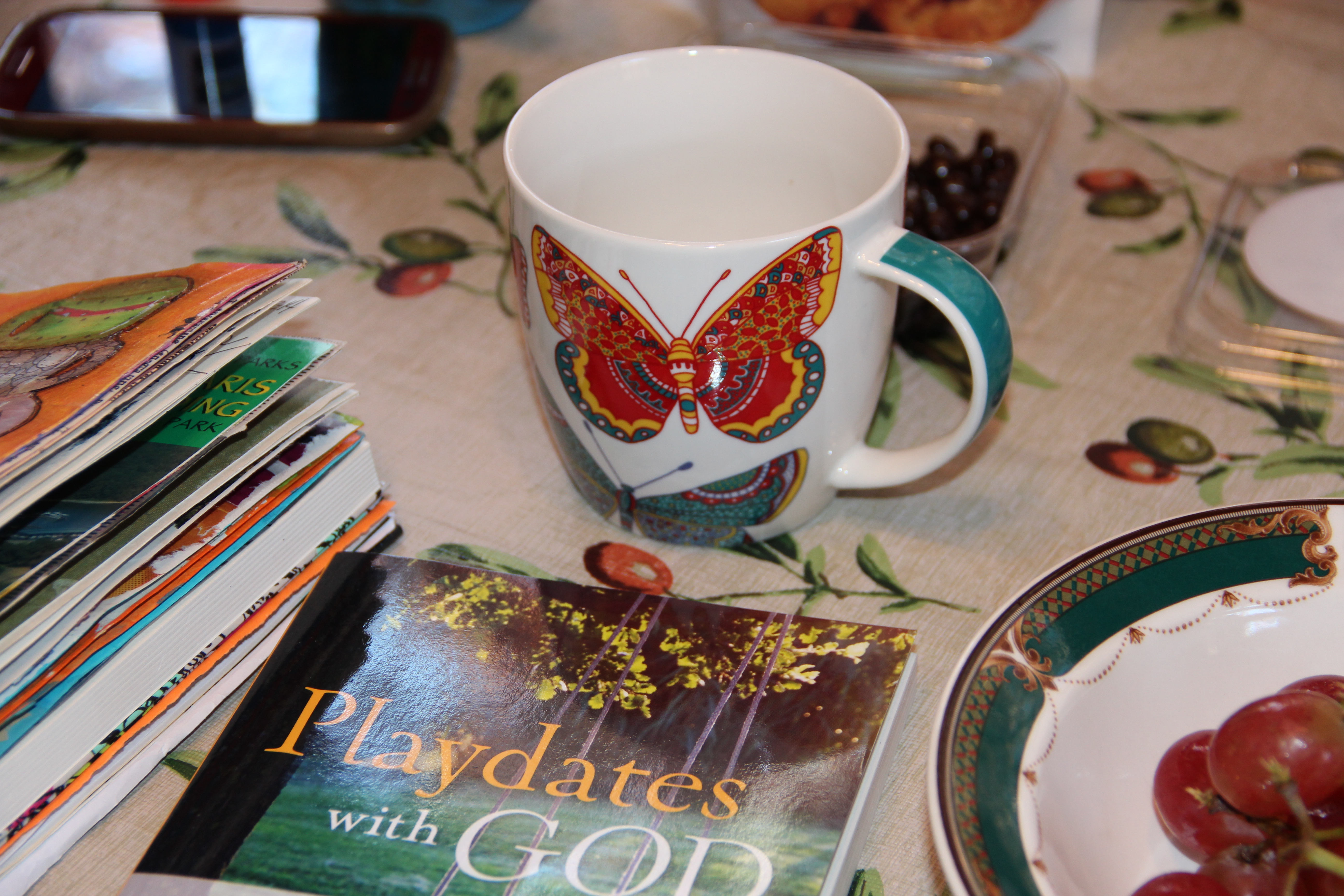 We didn’t know it, but GOD had a wonderful “playdate” planned for the three of us on this gorgeous fall day at Lynn’s retreat in the woods. We didn’t really have a plan, we just wanted to enjoy the day together. Lynn provided the space and yummy food. Kelly gifted us with whimsical mugs and new journals. And I brought collage supplies. (Perfect for three word-loving, journal-toting and collage crazy gals.)