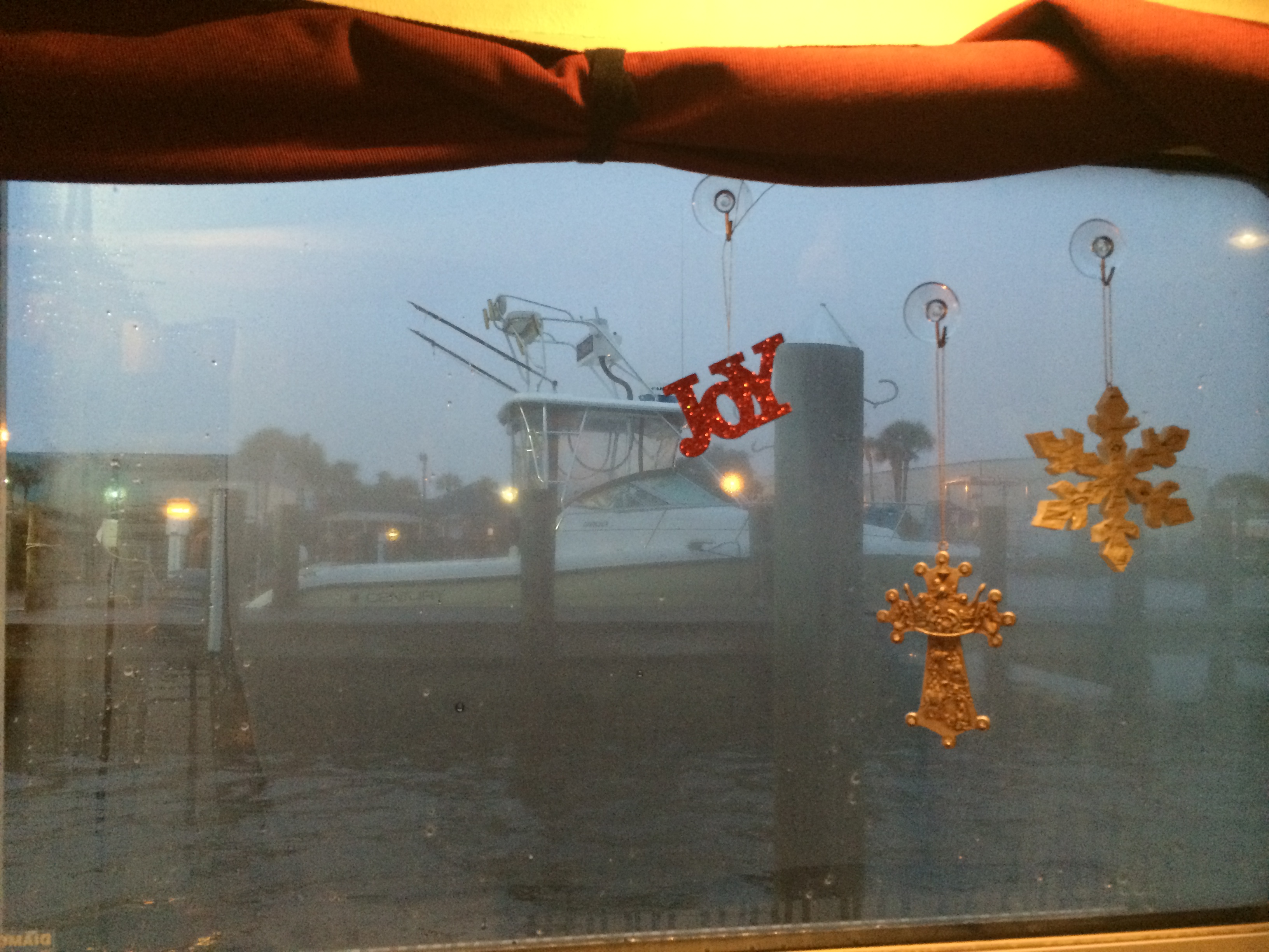 Life on a boat, as I have mentioned, breeds routine, so even though I thought I might sleep in, I didn’t. I rose with the dog, fed her, turned on the electric heater and started the coffee. I started cooking eggs for breakfast, when the power just stopped. So we had to stop everything to trouble shoot the problem. We unplugged our main power source, dried off the area around the outlets and replugged everything. And everything restarted, but I still whined, because I wanted one morning where we didn’t have to “work” on something to get our day started.