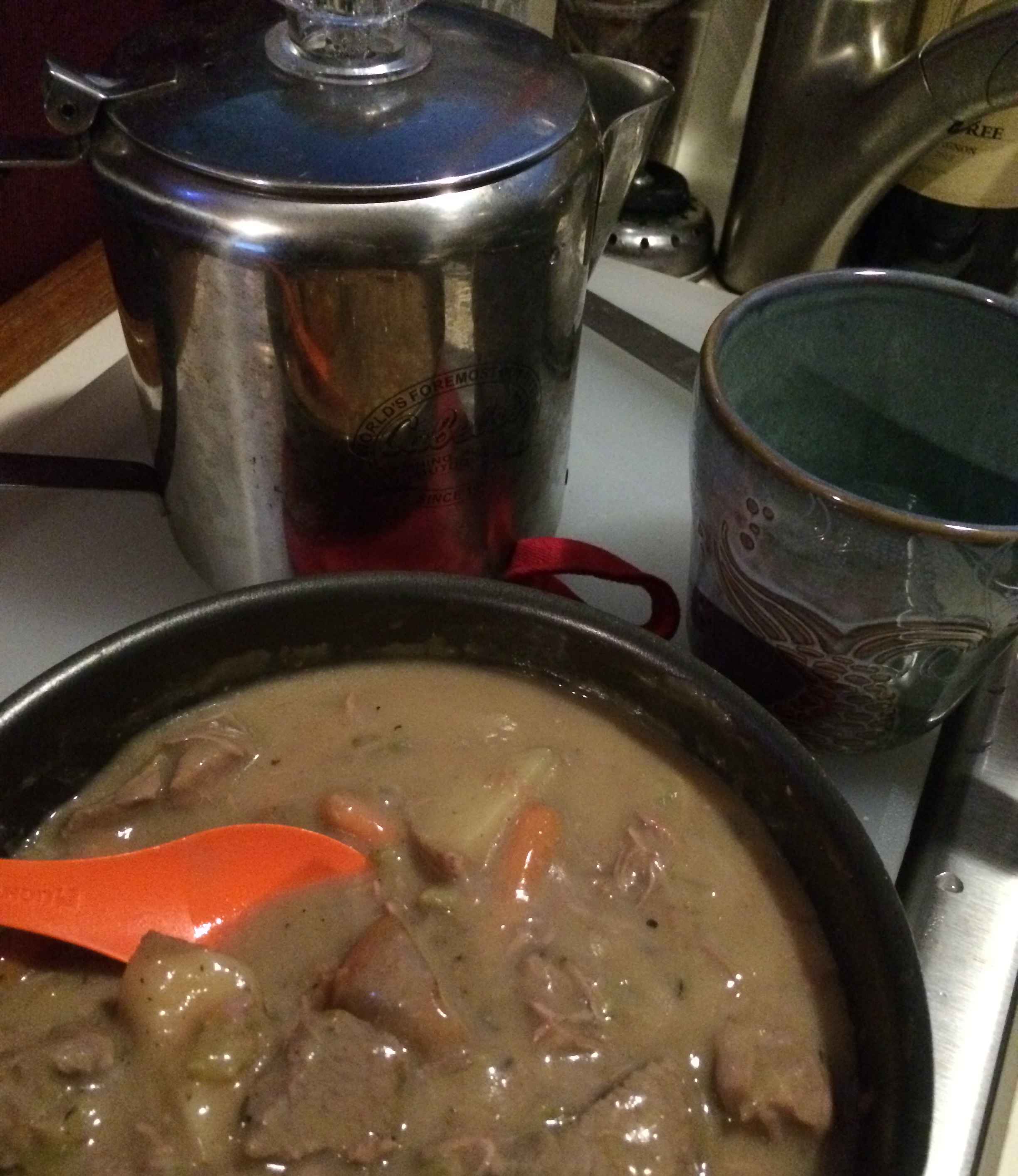 view from the “kitchen” window around 5pmLes and I were able to see a play based on “It’s a Wonderful Life” (we usually watch the movie together each year. this was a “Live Radio” play version, very good)finishing my ADVENTure tags to count the days til CHRISTMAS!my savory stew supped upon in solitude