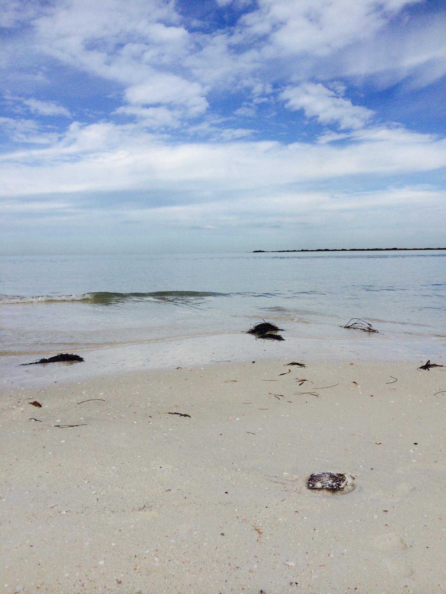 Today, I returned to Honeymoon Island to tackle the hike out to the northern point and then on the walk back, I wanted to collect shells. Shell collecting is a natural pasttime, especially on the best beach for shelling. (This region tends to throw the word “best” around quite a bit.) On my bike rides over to the island the past couple weeks, I started picking up shells for my “collection.” I have a shell book to help me to identify the shells, although I tend to pick the shells that inspire me with their shape, color or texture.
