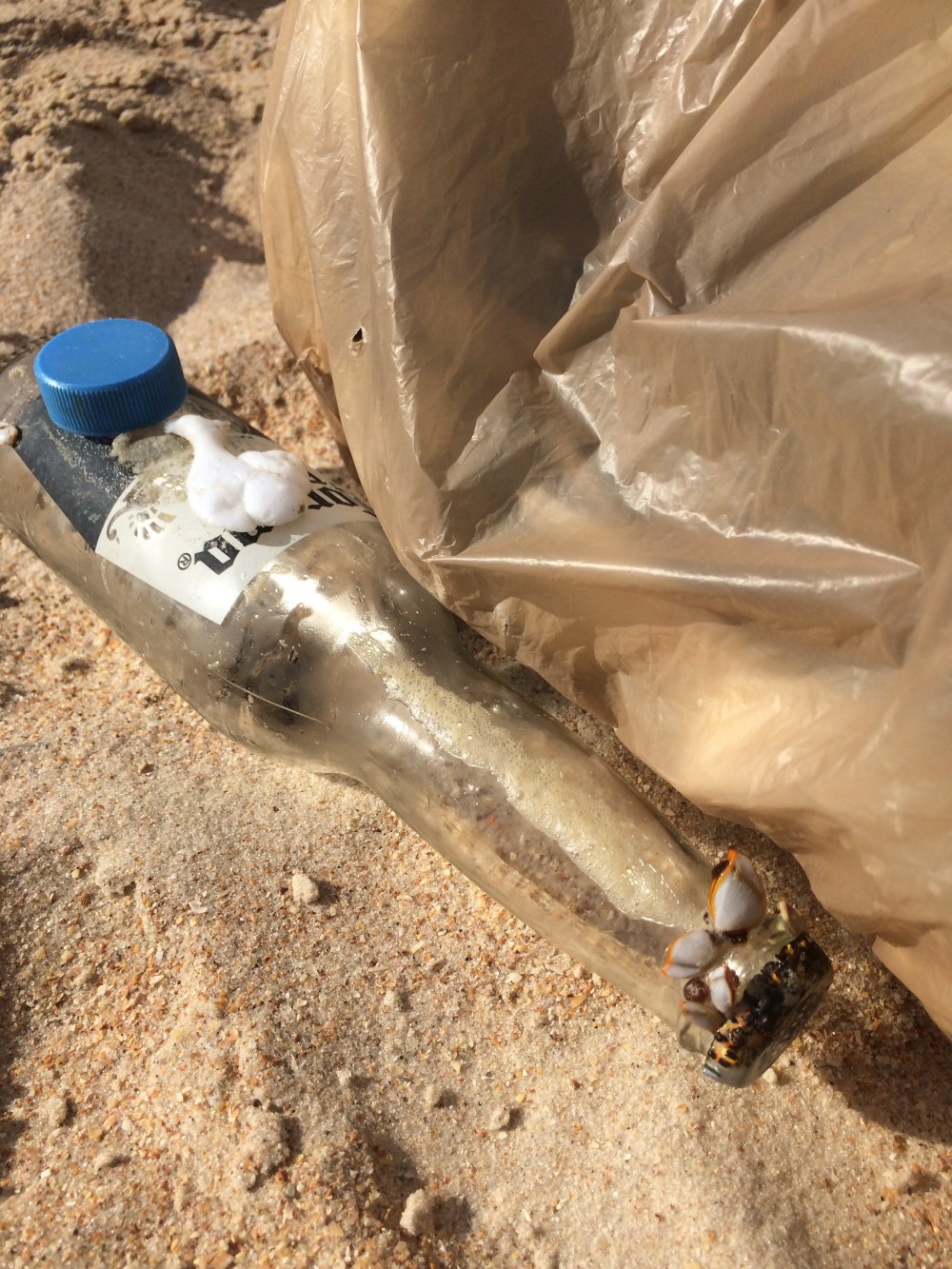 Usually a favorite past time at the beach is collecting shells. This time, I have been collecting artifacts. Artifacts washed ashore, as a result of the recent hurricane. Bits of Styrofoam from floating docks, egg carton lids, plastic caps, all sizes and colors, empty Chapstick tubes, plastic cigar tips, grocery bag remnants, candy wrappers, unpaired flip flops from child size to adult, water bottles, soda bottles, a crushed Mountain Dew can, and an empty Corona bottle with a rusty cap, which had picked up some passengers; coquina shells with their inhabitants still inside.