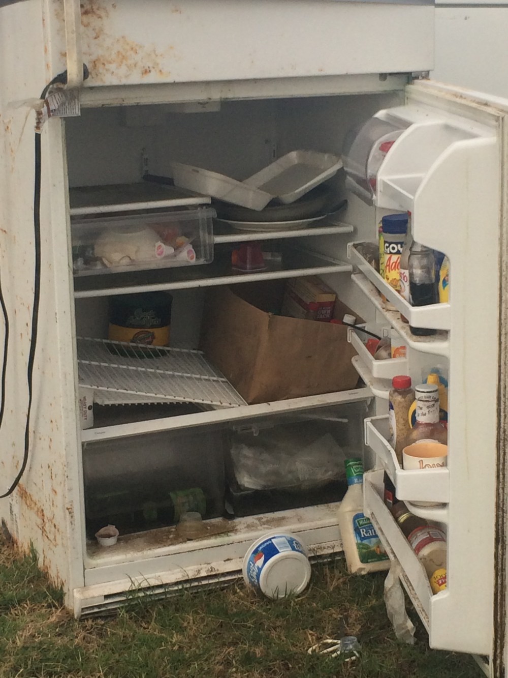 But yet, the I-beams continue to fascinate me, and the rocky shore shifts each day depending on the tide; it can be calm or spilling over with exuberance. And the lettuce seeds, which I planted in the colander from the thrift store have sprouted. (We might even get a little salad before we leave.) And the refrigerators lined up in the middle of the parking lot, who can forget those, taped shut for safety and lined up waiting for disposal. It seems like they have multiplied, as the surrounding buildings recover from the storm and begin the restoration process. One day, I noticed one of the doors had swung open, and inside, there was all the food left to rot and mold in the humidity and heat. (And it does give off a distinct odor, when the wind blows from a certain direction.) But that food just sitting there, begged me to take its picture. So I did.