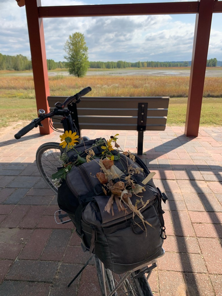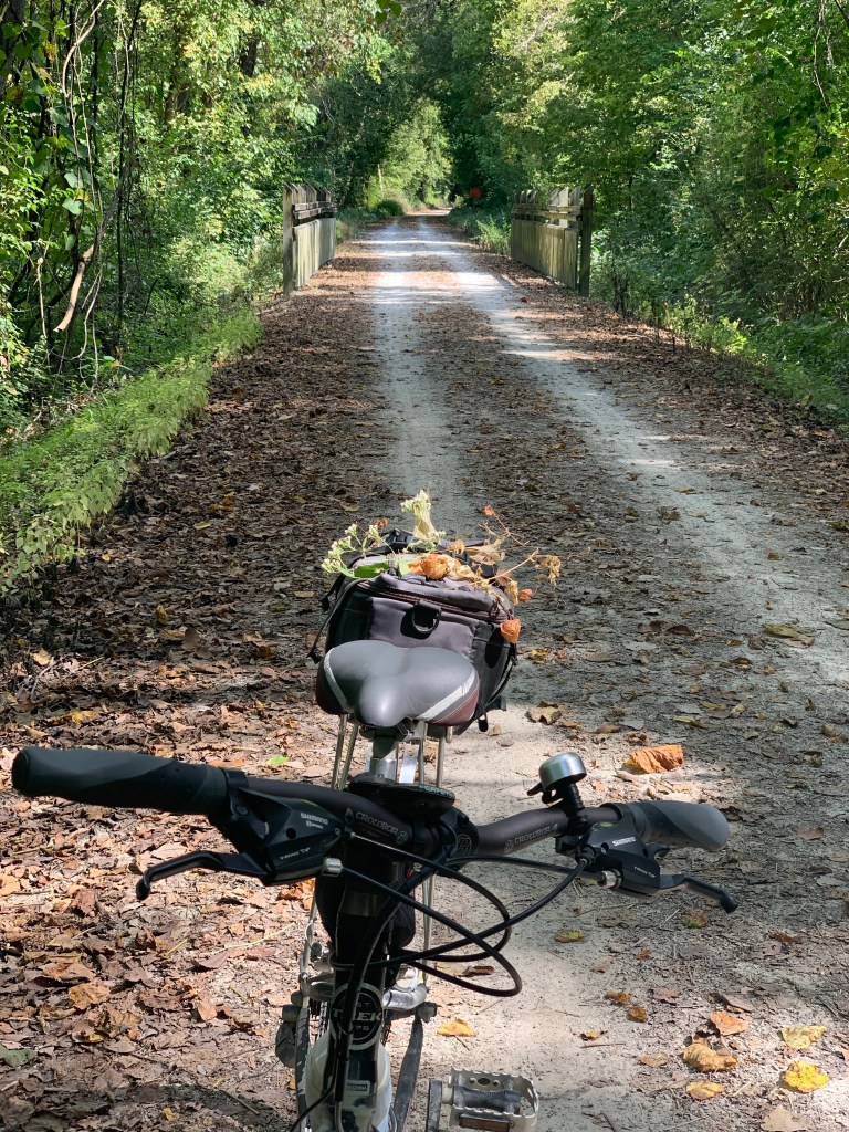 Twenty five miles to go! It’s no secret that the next phase of my trip could have been bogged down with having a meal, but I reminded myself that I could take it easy and not push myself. I found it comforting to be riding a familiar section of the trail. More people on the trail, but I was able to stay in my pilgrimage state of mind. Keeping my eyes open for natural beauty and my spirit buoyed up by singing songs to myself along the way. I also decorated my bike with “flowers.” I find that doing things that make me happy enhance my ability to stay focused on the goal.