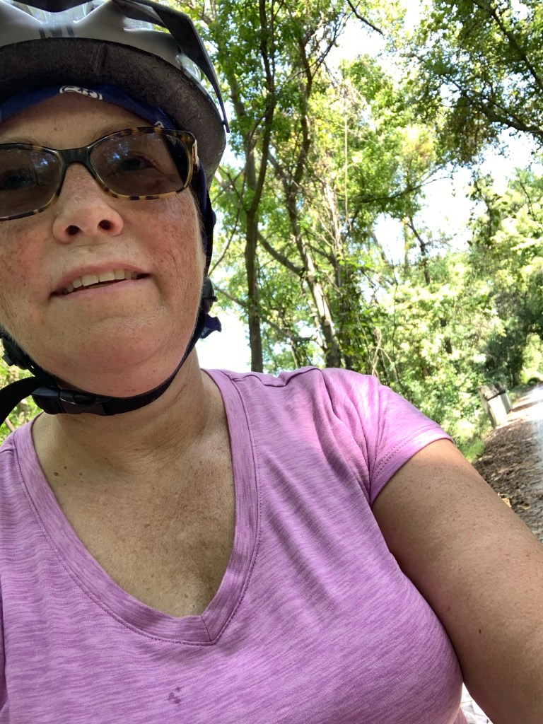 Back to the trail and my long ride. At 40.5 miles, I turned around because my coach had calculated that from that point I could ride home and be able to hit the 55 mark. I took a selfie and sent it to Les to celebrate.
