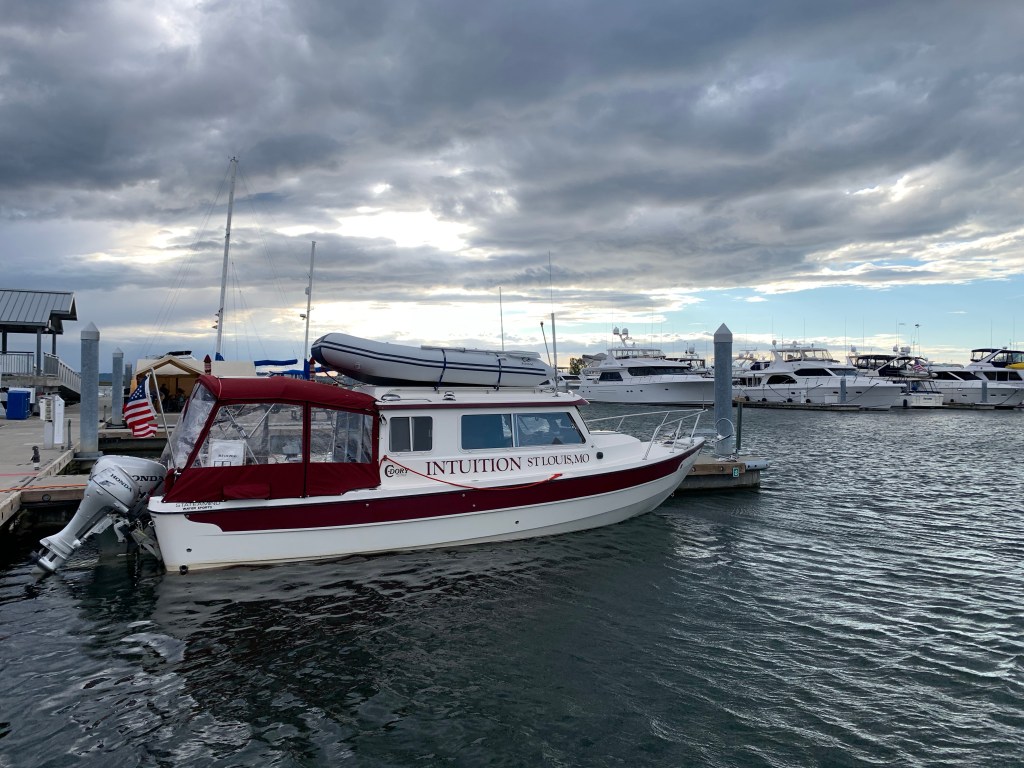 After towing our boat halfway across the country, we’re ready to embark on this adventure. We finished outfitting the boat with our new inflatable dinghy, recently bought groceries and topped off our water supply. We already gassed up the boat, while still on the trailer, at a gas station called Twin Peaks. (They had good coffee there, but I forgot to try their donuts.)
