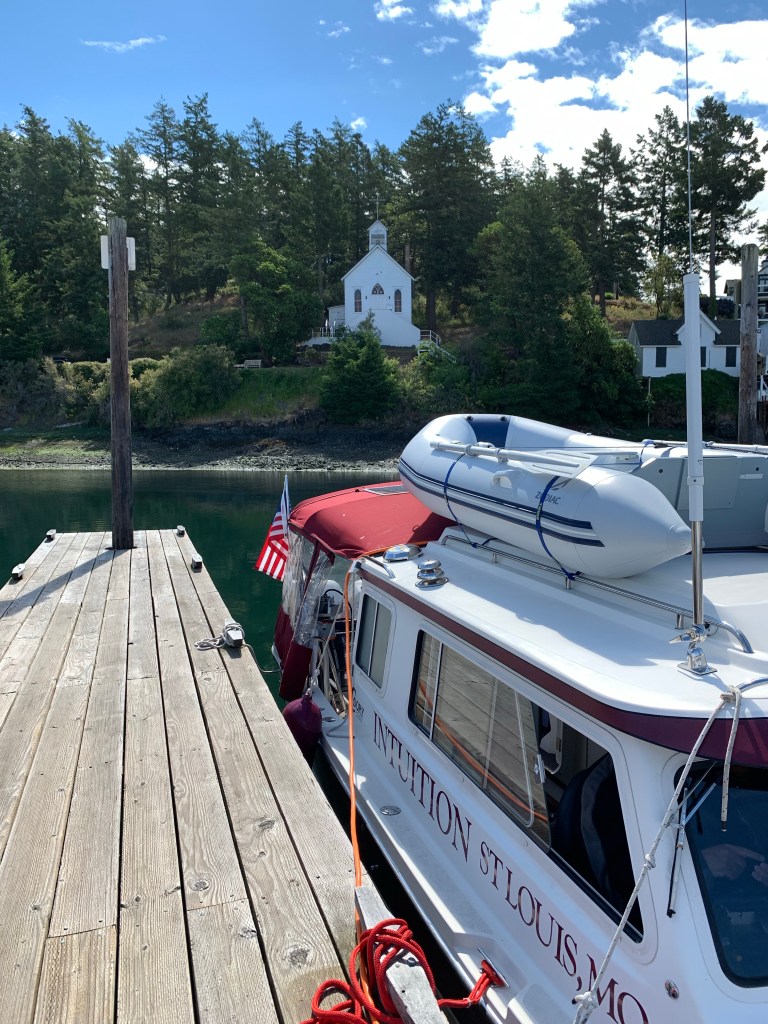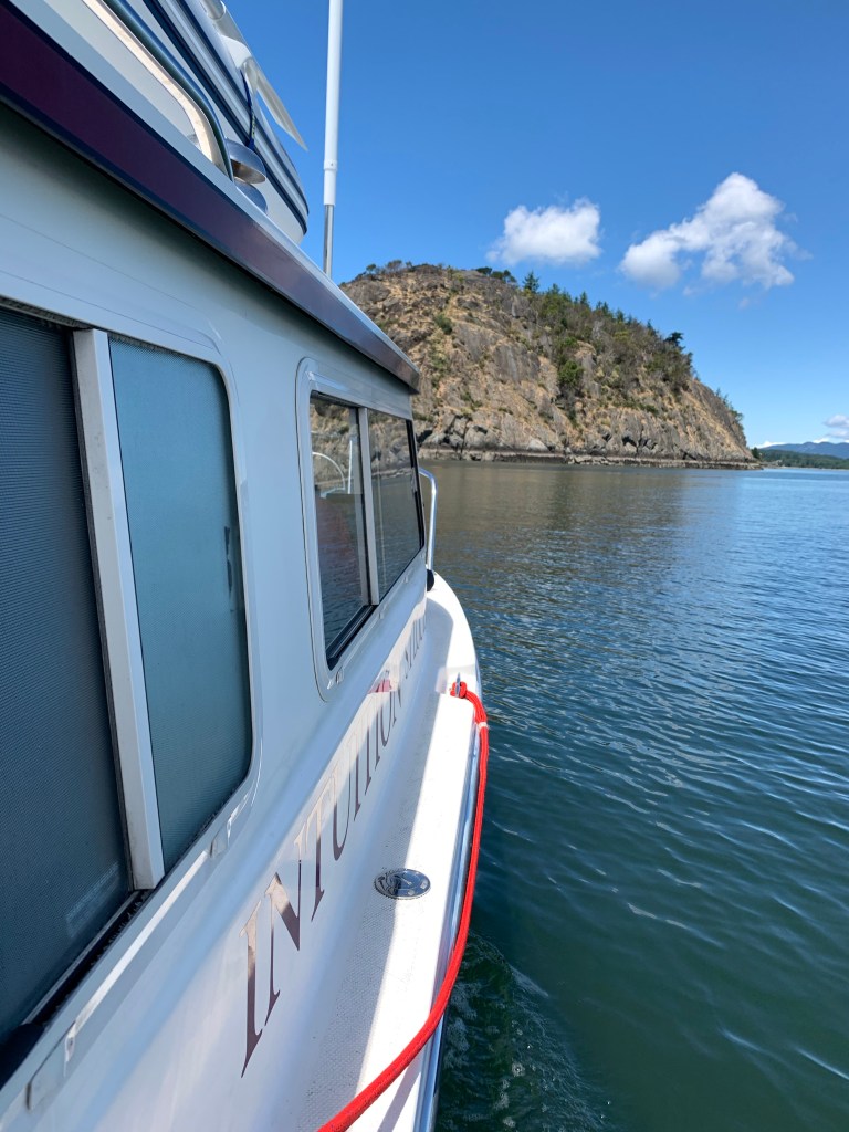 Once again we woke up with the first light of the day, to make our way to San Juan Island, leaving port at 5:15 am and arriving at the Roche Harbor marina by 10am covering 36 miles. The winds are supposed to pick up tomorrow, and our small boat gets pretty battered by waves that come abeam the boat when crossing a bay. We need to get to Sidney, Canada to check in before we cross from Washington waters to Alaska waters. On the Canadian leg, due to travel restrictions, we are allowed to cross their waters, with the limitation of no leisure activities and no getting off or mooring at marinas. We can anchor out in Canadian waters. We can stop for fuel and have groceries delivered. It will be our first time going through this process, so we don’t want to be fighting weather and the stress of a new situation. So we will keep checking the weather and wait it out to go at the most favorable time.