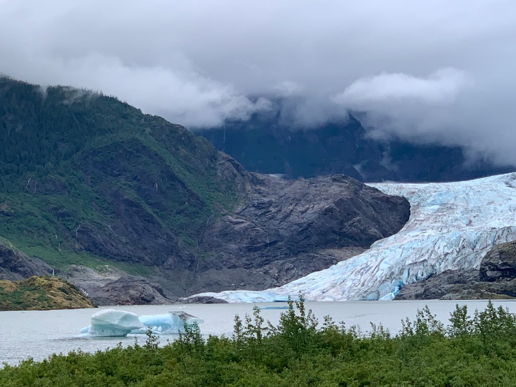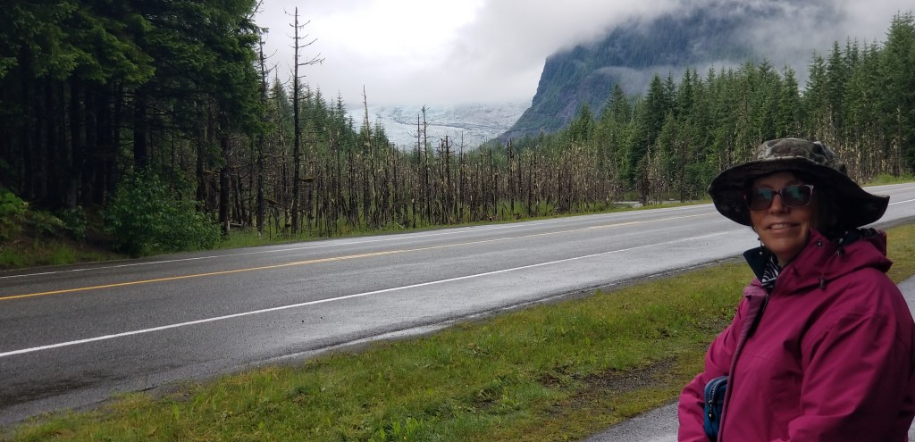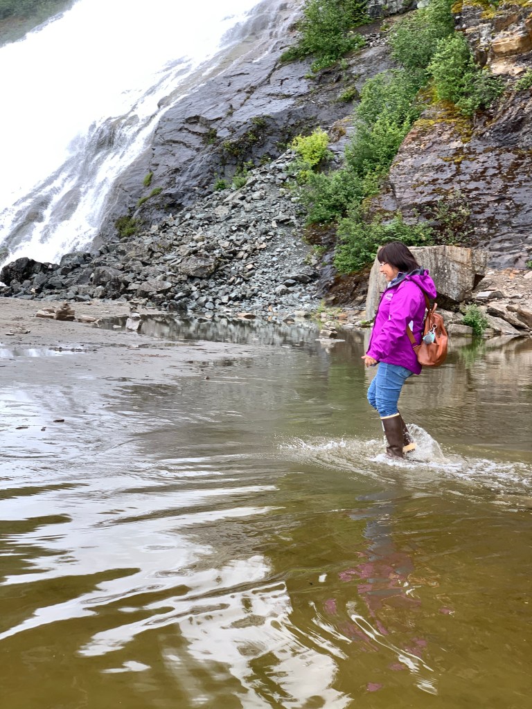 We planned to get up the next day to visit Mendenhall Glacier. I have learned on this trip that some glaciers are near the waterways, and others are land locked up in the mountains, and others spill down into a fresh water lake. Mendenhall is the land/lake type, which also boasts a massive waterfall right next to it. After researching the bus schedule, we hopped on a bus and headed out for a day of hiking and exploring the grounds near the glacier. We could have hailed a taxi, but there is something romantic about taking public transportation. The closest bus stop near the glacier was a 1.5 mile hike to the entrance of the park. We enjoyed chatting, and noticing signs about bears and then about half way there we turned a corner. I exclaimed audibly, “Look at that!” It was the glacier. Such an awesome sight, which we experienced because we chose to hike there.