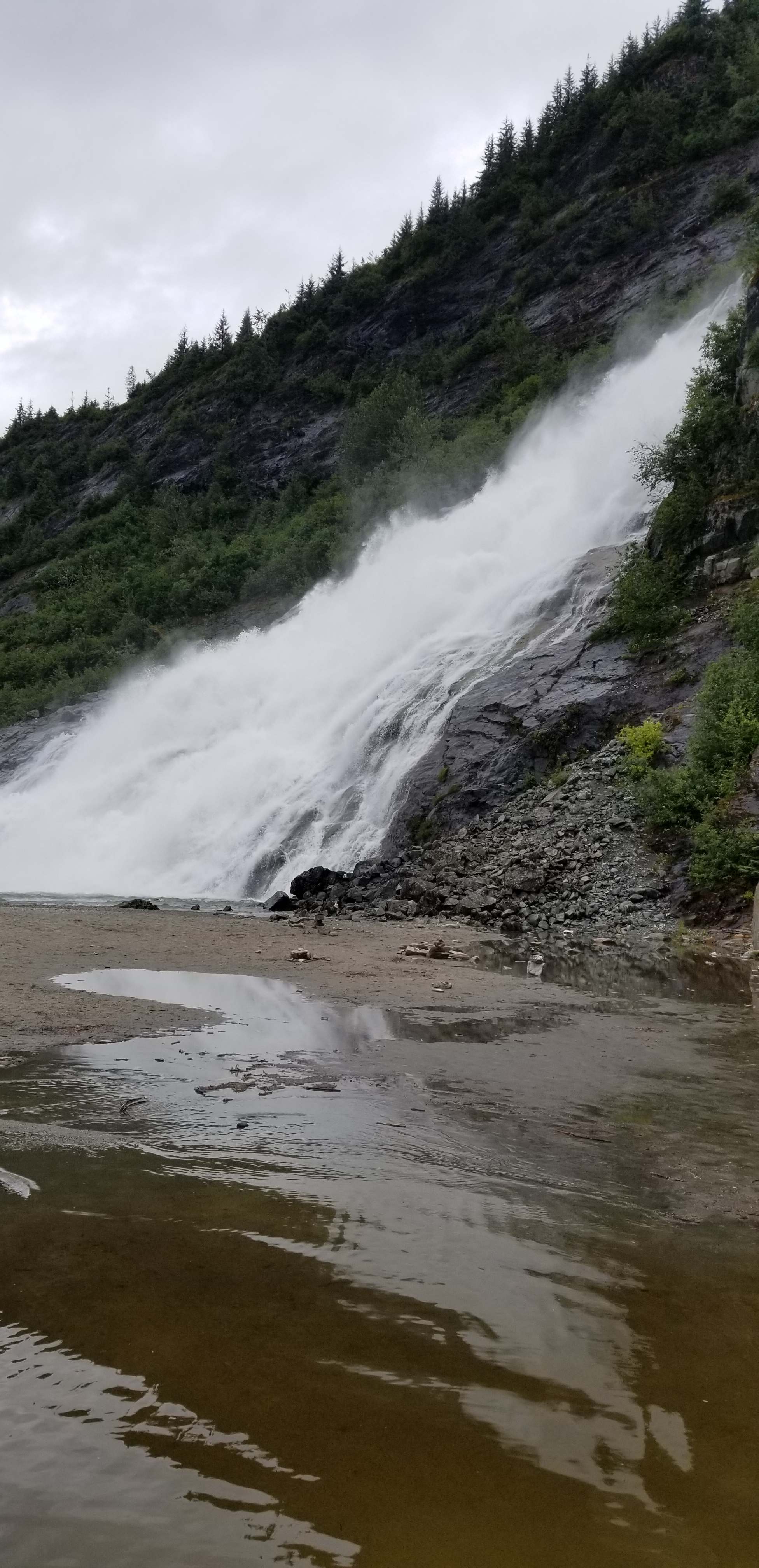 Before we left in the morning, Les suggested that I wear my tall waterproof boots, since we planned to hike to the foot of the waterfall next to the glacier. Little did I know that my choice would end up being a blessing to another fellow traveler. Les and I walked along the path noticing the flowers and mushrooms. We noticed little trickles of water, and a medium flow of water over rocks, and then we turned the corner to the sound of the rushing water, which silenced all other sounds. What wonder to stand near the foot of a glacial waterfall.