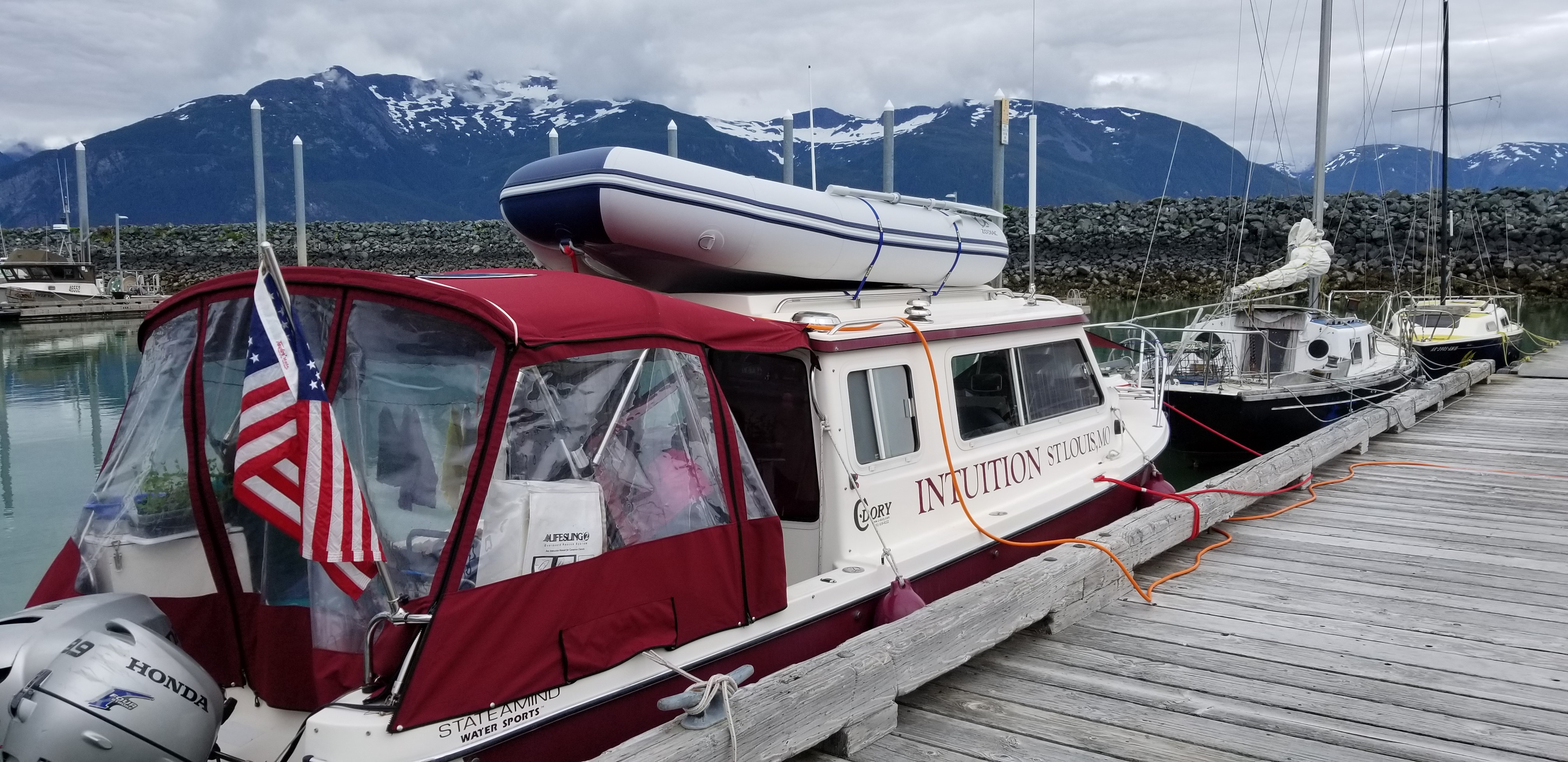 Lots more of that Southeast Alaska liquid sunshine today. Except for a few short interludes, a steady light rain fell all day. We untied and motored over to the ramp at 8:00 am to pull the boat for motor service. Conrad from Karl’s Auto and Marine Repair (the area Honda servicing dealer) met us with a big, 3-axle trailer onto which he loaded Intuition and towed it to their shop a few miles away. We’ve logged about 160 hours since the last oil change, so it was due.