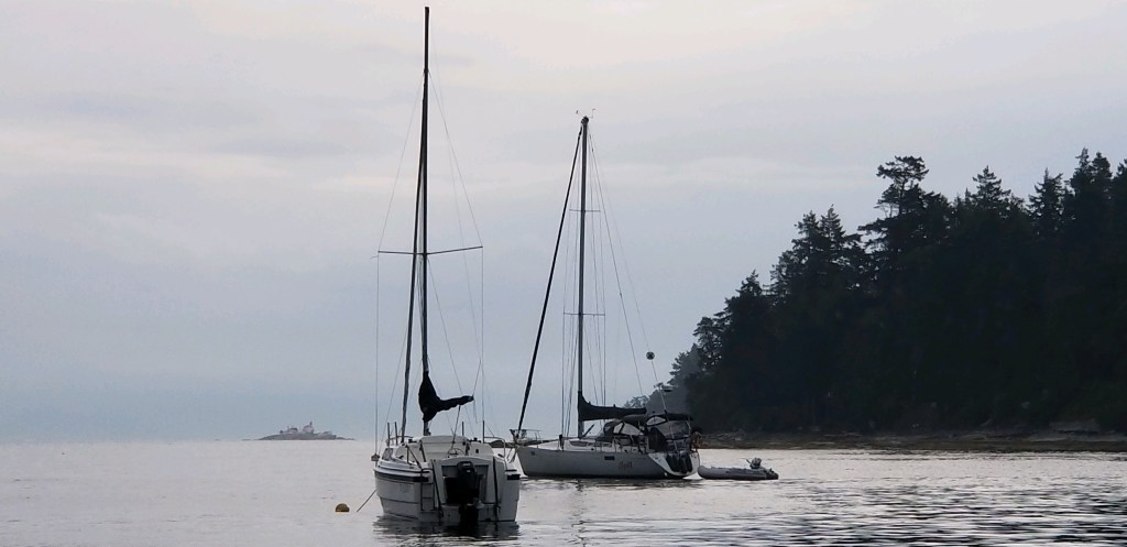 My latest plan for the day was to spend the night at Northwest Bay. With the calm seas this afternoon and brisk winds forecast for early tomorrow, we decided to keep going. Waves became bigger and messier the closer we got to Nanaimo, forcing us to slow down. We made it to Pilot Bay at the north end of Gabriola Island at 6:30 pm, as we had missed the window late this afternoon at Dodd Narrows. This anchorage puts us just a few miles from Dodd Narrows and limits our open-water exposure should winds be strong in the morning.