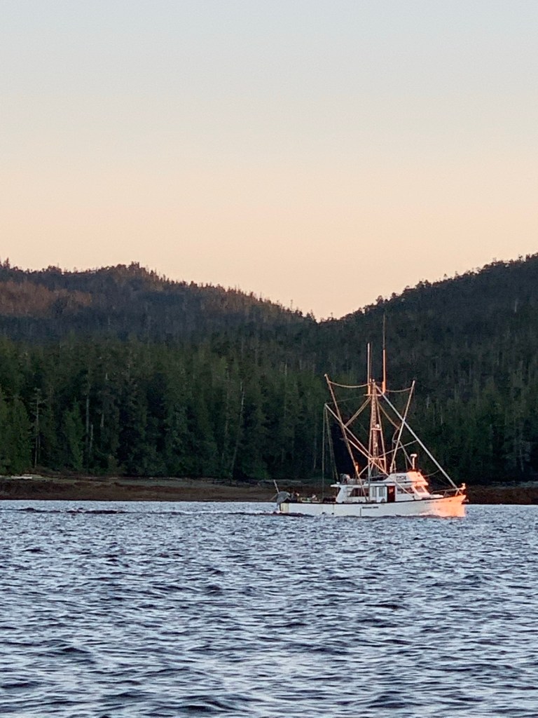 The day continued clear when we pushed away from Thorne Bay at 3:00pm, but the waves built as we crossed Clarence Strait toward Caamano Point and the entrance to Tongass Narrows on the other side of Behm Canal. The waves were mostly on our bow and weren’t dangerous, but 7 mph was as fast as we could go without having all our possessions end up in the middle of the cabin. A mild jab to the ribs from the dinette table when a wave hit us as I got up to fill my water bottle reminded me that moving around much in these conditions is not without risk. We joined a line of fishing boats returning to Ketchikan and entered the smoother waters of Tongass Narrows while avoiding two barge tows going the opposite way.