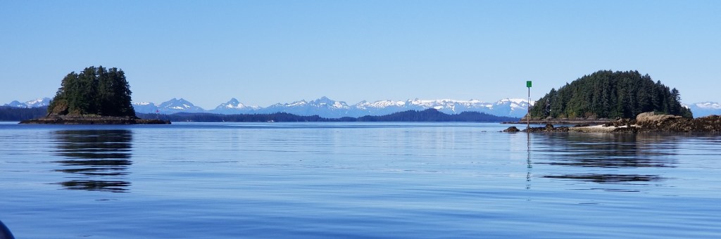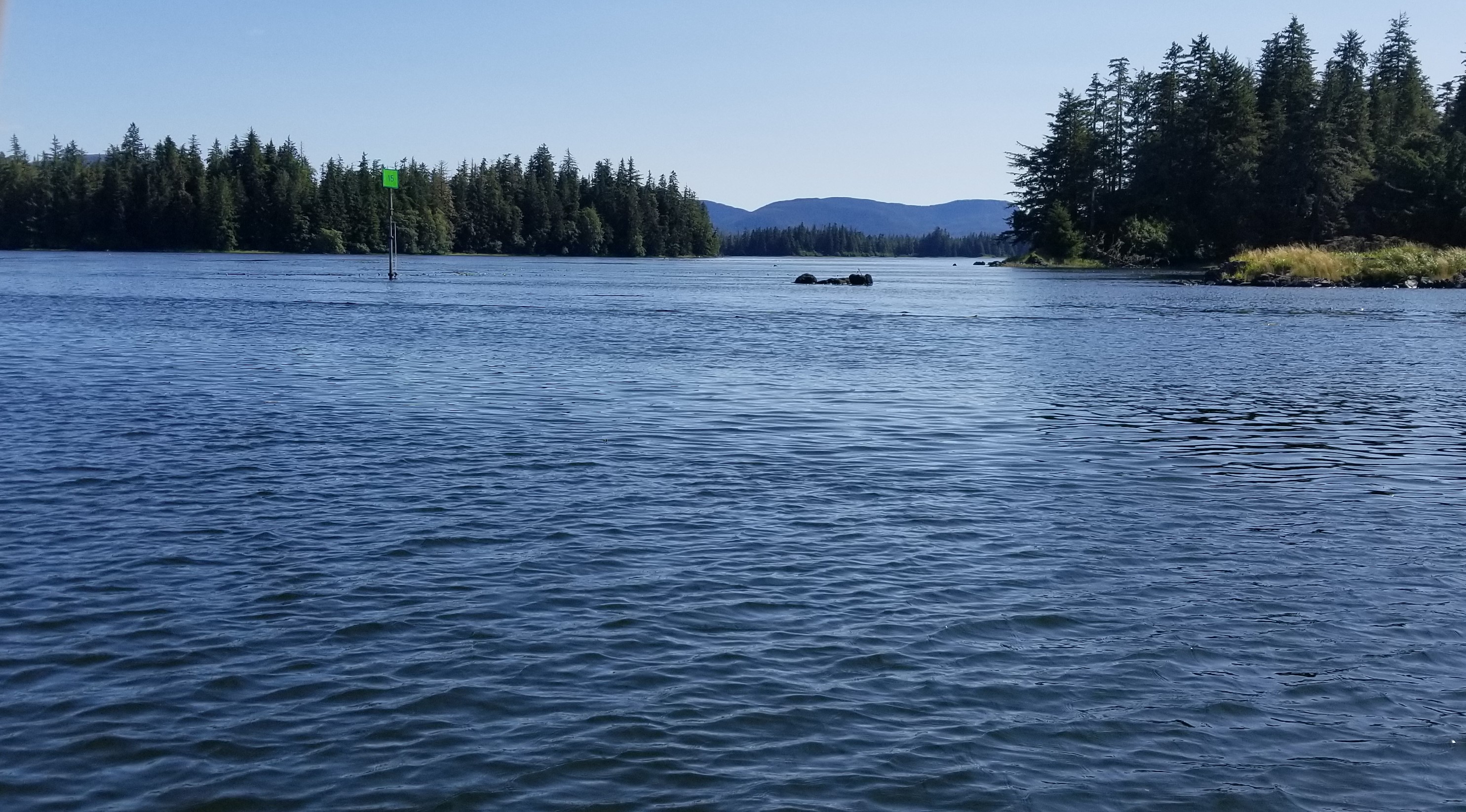 We left the Kake floats at Portage Harbor shortly after 10:00 am and meandered between the islands that separate Portage Passage from Keku Strait. Since it was a clear and sunny day, we could look across and see the snow-capped peaks of Baranof Island beyond Kuiu Island. All of Keku Strait was picturesque, especially today with light winds and clear skies. Heading south during the peak of the flood tide, we got a noticeable boost in speed through some sections. We arrived at the north entrance to The Summit at 1:50 pm. There was still just a little current at our stern, but no issues with steerage. The Summit has a couple very shallow turns, and its challenge lies in maintaining a course through the very narrow channel. With a 15-foot high tide, we saw slightly less than 18 feet a few times. I made a Securite call entering The Summit; another cruiser coming the opposite direction waited for us at the south end, as there’s really not much room for two boats to pass in this section.