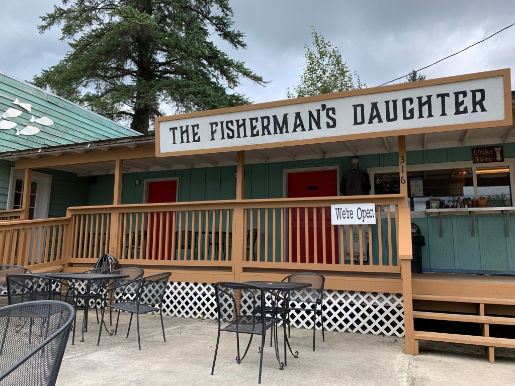 Hoonah is a small, friendly community with one great restaurant, The Fisherman’s Daughter. On Thursday, we ate dinner there. Les had a scrumptious burger with deep fried mac n cheese on top, and I enjoyed halibut “nuggets” with a curry soup as a side. We sat outside watching the town folks walk by or come up and order a cup of soup to go. On Friday, we ate breakfast there.