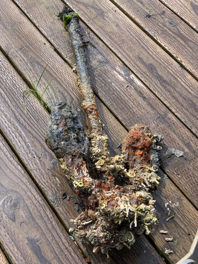 I deposited the old anchor and all its attached marine organisms at the top of the marina walkway next to the dumpsters. Kel mentioned it to the dockmaster and a lady at the souvenir shop across the street – the anchor was gone within an hour.