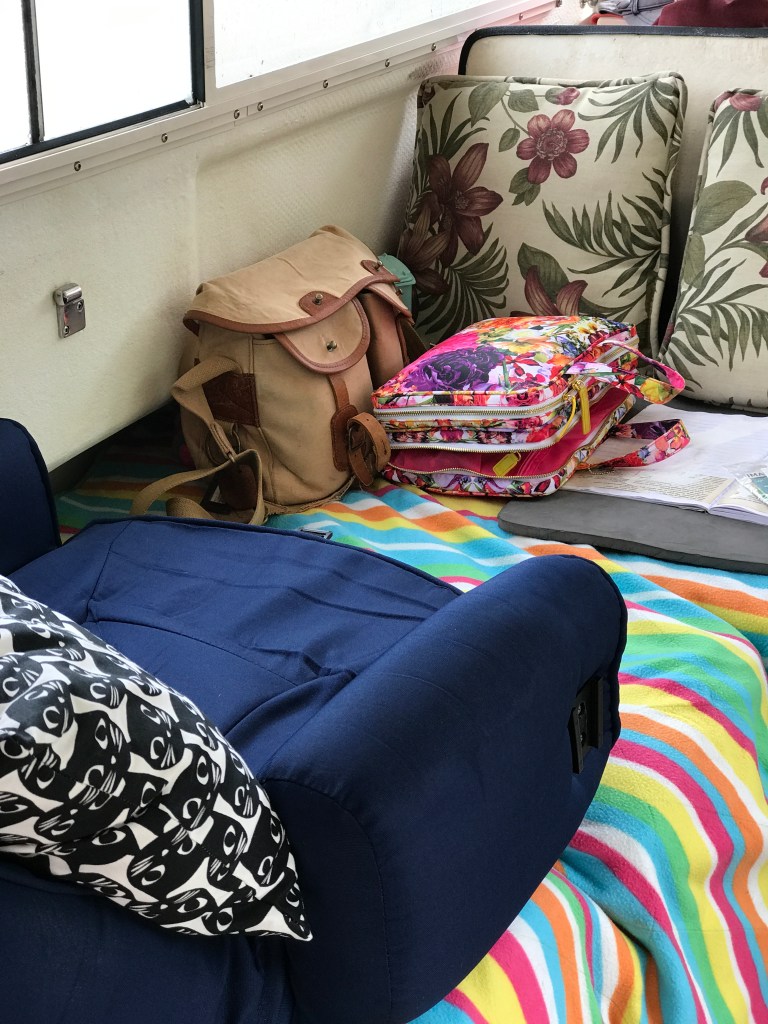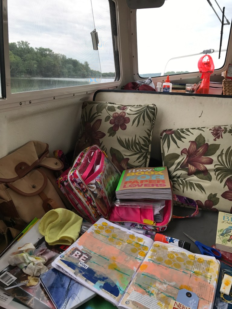 The kitchenette converted into my chaise lounge (Upper Mississippi trip 2017)My lounge covered with art supplies (Upper Mississippi trip 2017)