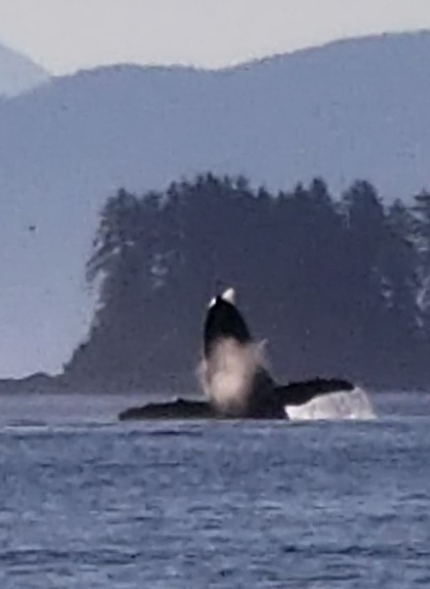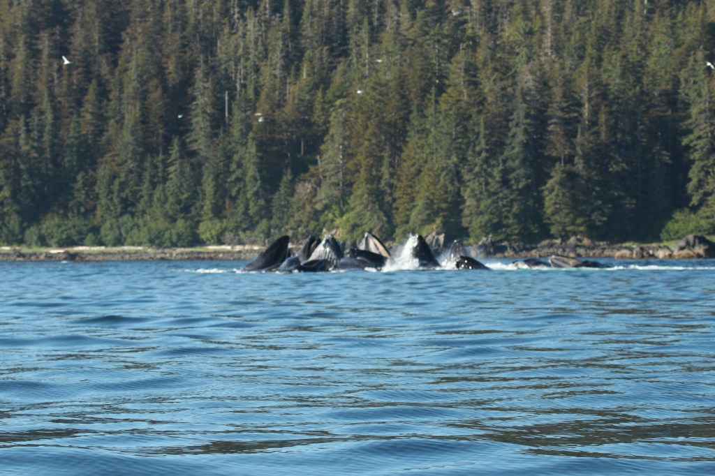 We stopped and watched them for nearly an hour – this was our first time seeing a group of whales this large (8-10 whales). At some point they became “exuberant”, with one whale continuously tail slapping, while two others breached repeatedly. After a couple minutes of this activity, they moved into the mouth of the inlet, at which point a second group of whales arrived. Both groups began bubble-net feeding, each group exploding out of the water 2 or 3 times before they moved on. It was an amazing spectacle to witness this full range of activity.