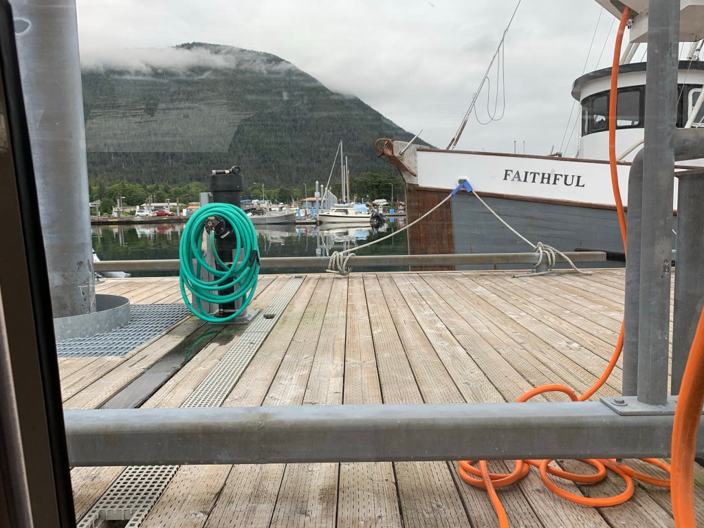 Arriving in Sitka before 3:00 pm, we called the Sitka harbormaster to request a slip. He indicated he didn’t have any slips for a 25-foot boat and to look for a spot on either the north or south outer wall of Eliason/Thomsen Harbors. We saw what looked like an available spot on the south outer wall, so continued a little farther to Petro Marine to refuel before swinging back. The spot turned out to be right next to a 30-amp pedestal, so will work well for us. Being on the outer wall leaves us open to wakes from the constant parade of marine traffic, but most boats have been good about honoring the no wake zone.
