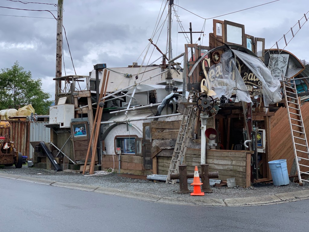 Tuesday, Les scheduled a haircut, and I met him there walking via the fishery road, because it was shorter. (We had walked back through uptown the day before, and indeed it was longer and steeper.) The “no-see-ums” seemed to have gone elsewhere. On my way to the barber, I met Chas. He was walking ahead of me, and paused at an intersection just as I was coming up to Scotty’s place. Scotty’s place is a mish-mash of marine objects and ladders and container-like buildings that reminded me of a sculpture. I paused to snap a photo, and Chas started up a conversation with me, and we chatted as we both walked toward town.