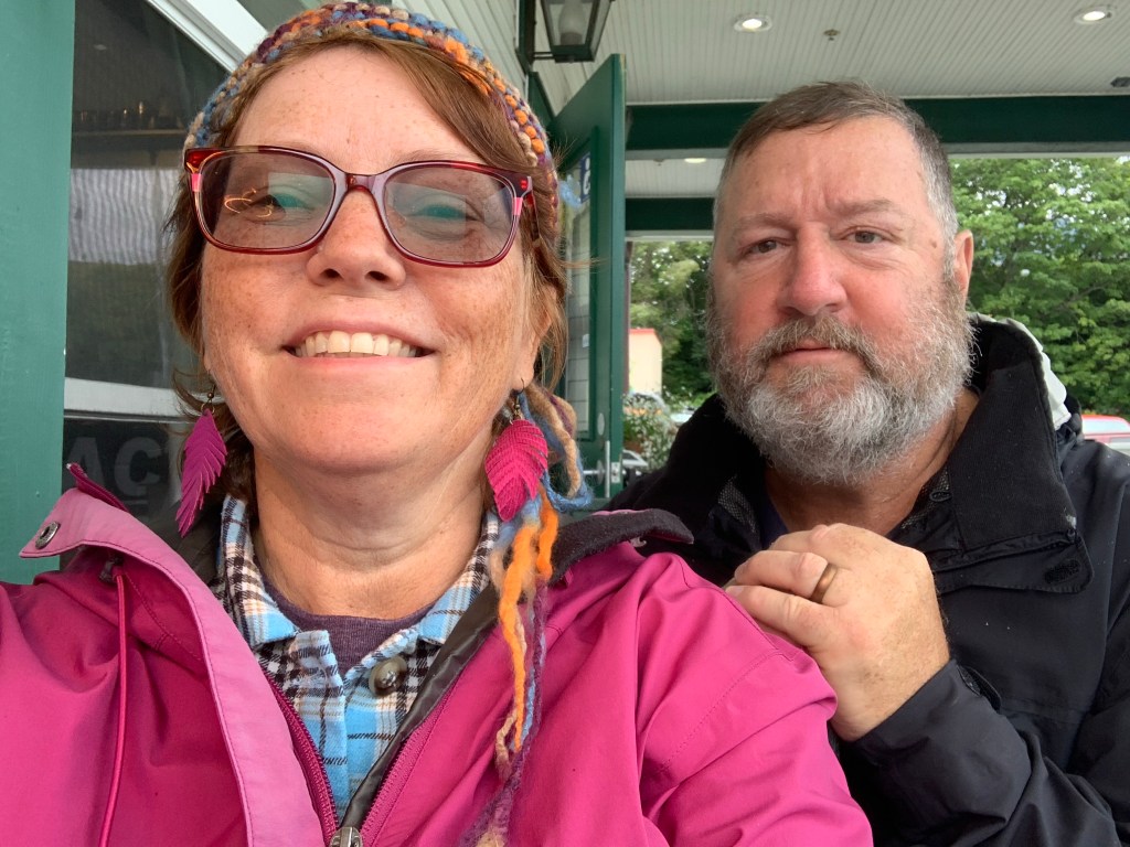 So what is there to do in Hoonah over a weekend, besides our routine chores? Walk in the rain to check out the gift shops, shop at the local, small “Costco” store with bulk food for sale (aka Collette’s Cupboard), continue to walk in the rain about a mile to the hardware store to buy a geranium (I love greenery on the boat, what can I say?) I also bought a little step stool to get up into my perch. I had a shorter one that works as a good footstool when I sit at the table. Creature comforts matter when you’re seating arrangements are limited. I carried all my purchases, two bags and the stool, back the mile in the rain to our boat. It was a good afternoon walk. It rained most of the day and evening, and we were a bit wore out from the anchor incident, so we had dinner at The Fisherman’s Daughter. (Beef and barley soup was wonderful on a chilly, wet evening.) Apparently the locals thought so as well.